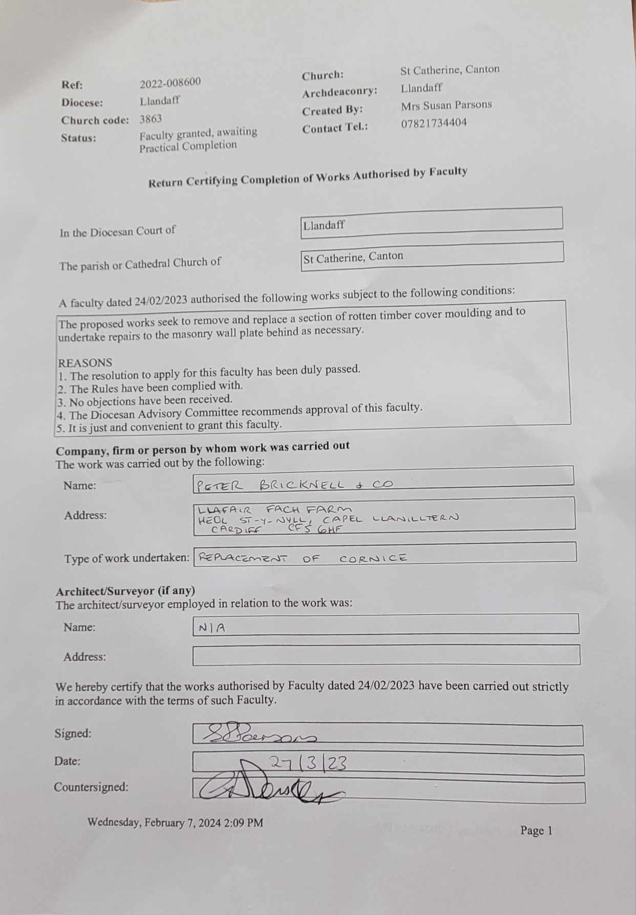 Completed by church committee members in the absence of architect